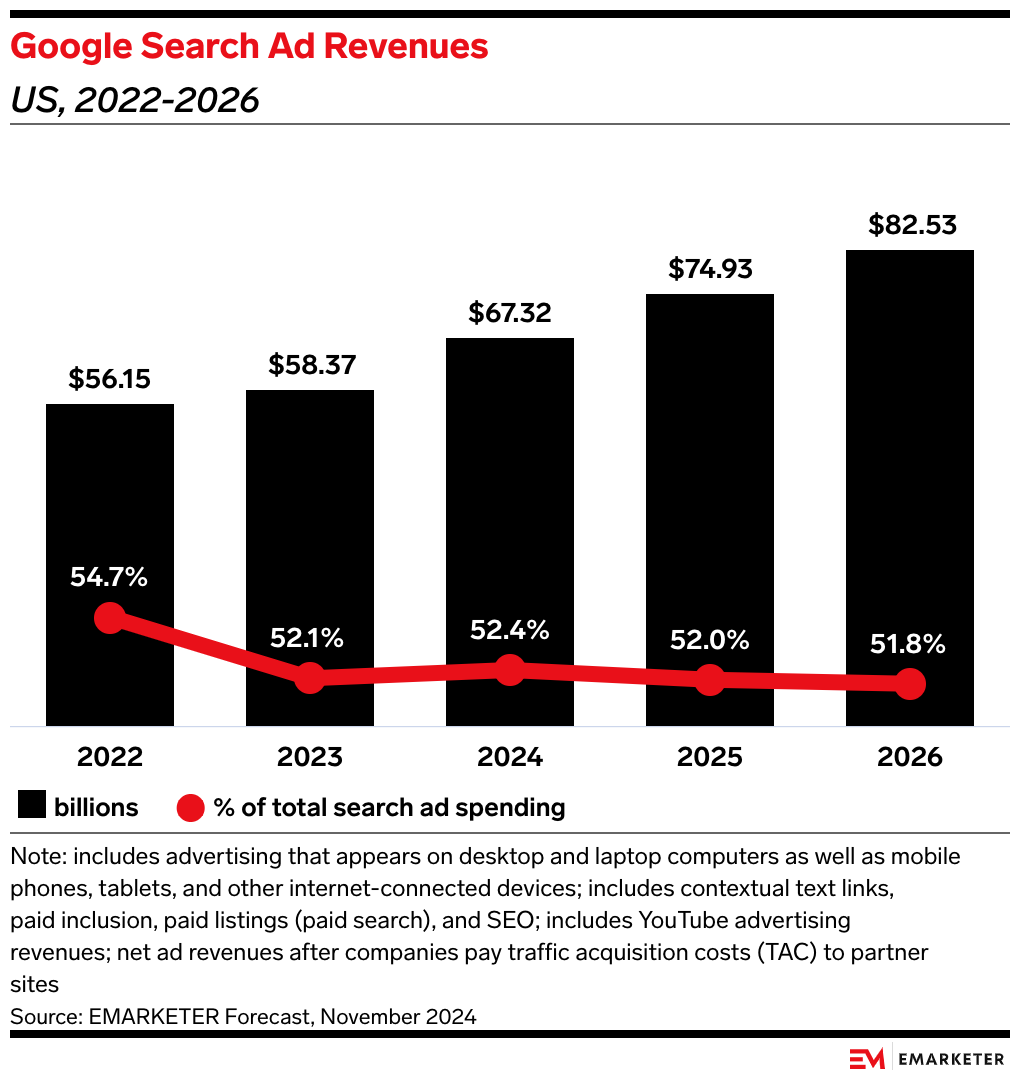 • Perhaps the most potent threat to Google’s market lead is an August ruling from a US Justice Department lawsuit, which found that the company operates an illegal search monopoly. In a second trial, the DOJ suggested that Google should sell Google Chrome, the largest web browser in the world by market share, which could significantly reduce its advertising capabilities.