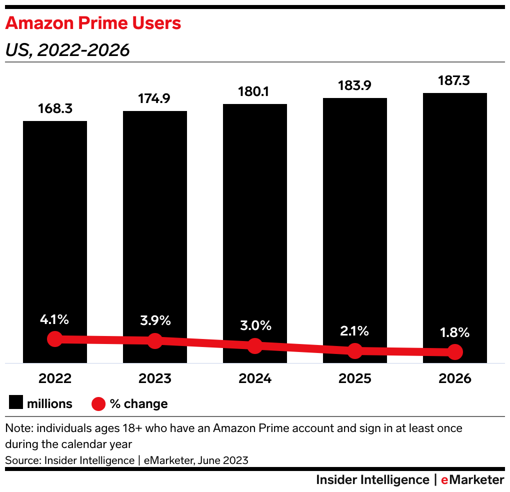 • The number of Prime users will grow just 3.9% this year and slow to 1.8% by 2026, according to our forecast.