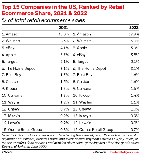 Like most retailers, Amazon suffered from increased expenses resulting from ongoing supply chain issues, excessive warehouse capacity, and labor shortages. We expect Amazon’s first-party (1P) sales will decline, while third-party (3P) marketplace sales will increase to account for more than 65% of its sales by next year. But Amazon has a lot of irons in the fire that should help it bounce back quickly. It’s opened a new physical fashion store, increased in customer-facing tech solutions that reduce friction (like virtual shoe try-ons), and doubled down on its grocery business (typically a recession-proof category). Add that to the return of Prime Day in July, with the potential of a second event in Q4, and things may not be so bad for the ecommerce giant.