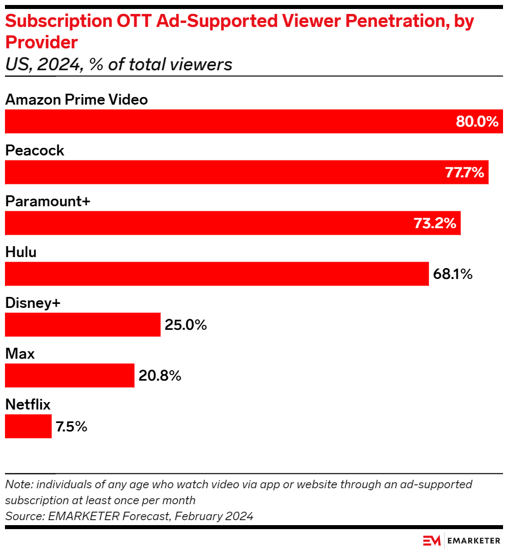 - Amazon Prime Video will have 130.4 million US ad-supported viewers this year, accounting for 57.6% of subscription OTT video viewers, per our February 2024 forecast.
