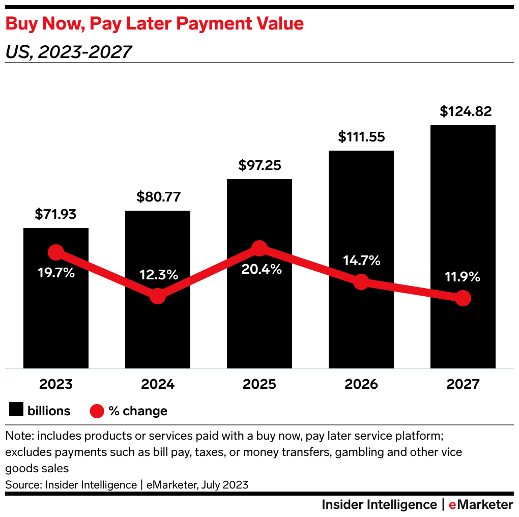 Buy now, pay later (BNPL) is still a small retail payments player. While 73% of US consumers said they’d heard of BNPL in 2022, just 5.8% said they’d used it at least once over a 30-day period. US BNPL value will hit $80.77 billion in 2024, per our forecast—just 1.1% of total US retail sales. That share will tick up to only 1.5% by 2027.
