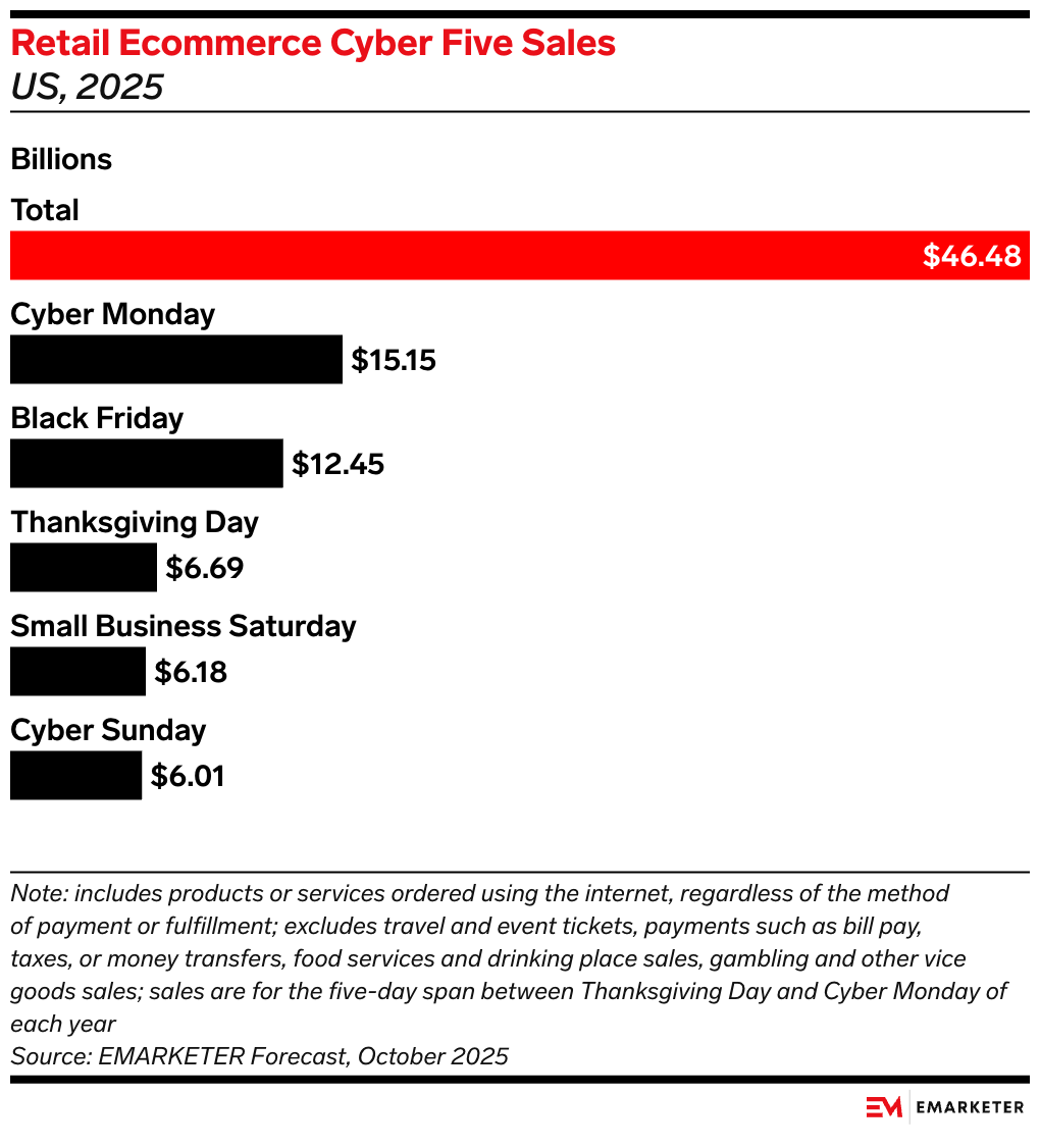 What it means for marketers: They may be named after specific days of the week, but Black Friday and Cyber Monday are now monthslong advertising events that require brands to compete fiercely for attention across platforms and ad surfaces. As even Black Friday shopping moves online, advertising with the tail end of the Cyber Five period in mind could help with both day-of sales and December shopping.