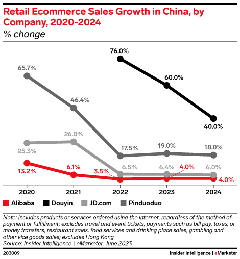 KEY STAT: Douyin’s retail ecommerce sales in China will grow by 60.0% in 2023, far surpassing growth rates seen by Alibaba, JD.com, and Pinduoduo.