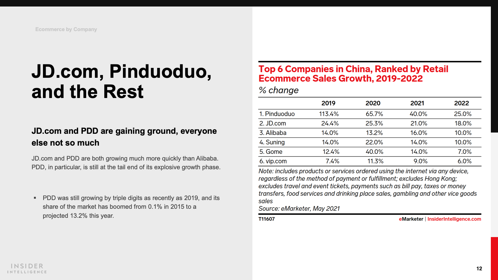 Alibaba remains the biggest ecommerce player in the world by sales but had a disappointing 2020 and saw its share of China’s ecommerce market drop below 50% for the first time. Pinduoduo (PDD) and JD.com are growing much faster. We forecast that in 2021 PDD will claim a 13.2% share and JD.com a 16.9% share. These “Big Three” will account for 77.2% of the market this year.