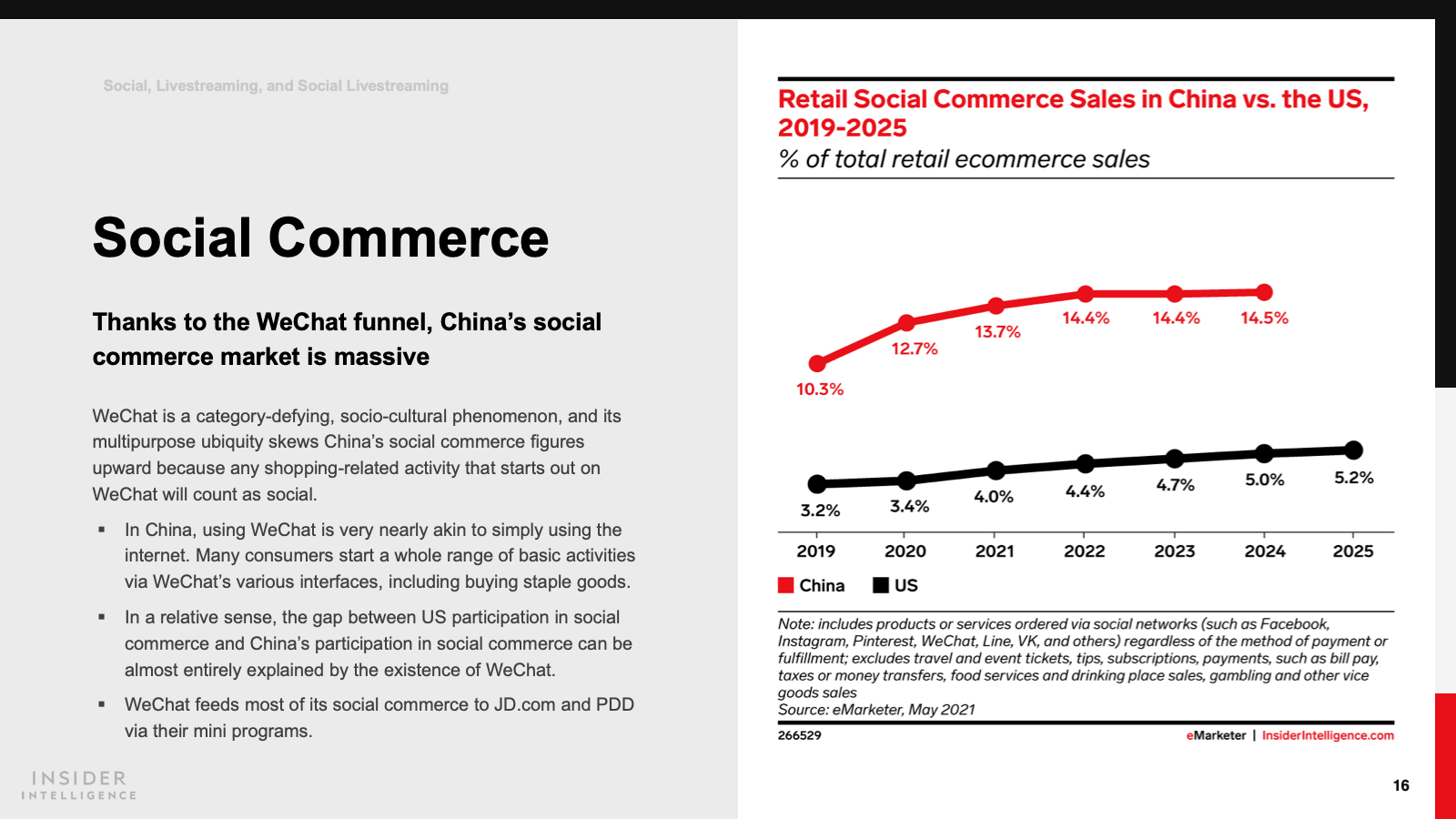 China’s social commerce figures are already 10 times what they are in the US at $351.65 billion. But the new story is livestreaming social commerce, which will grow by 95.5% this year and account for more than 50% of social commerce by next year.