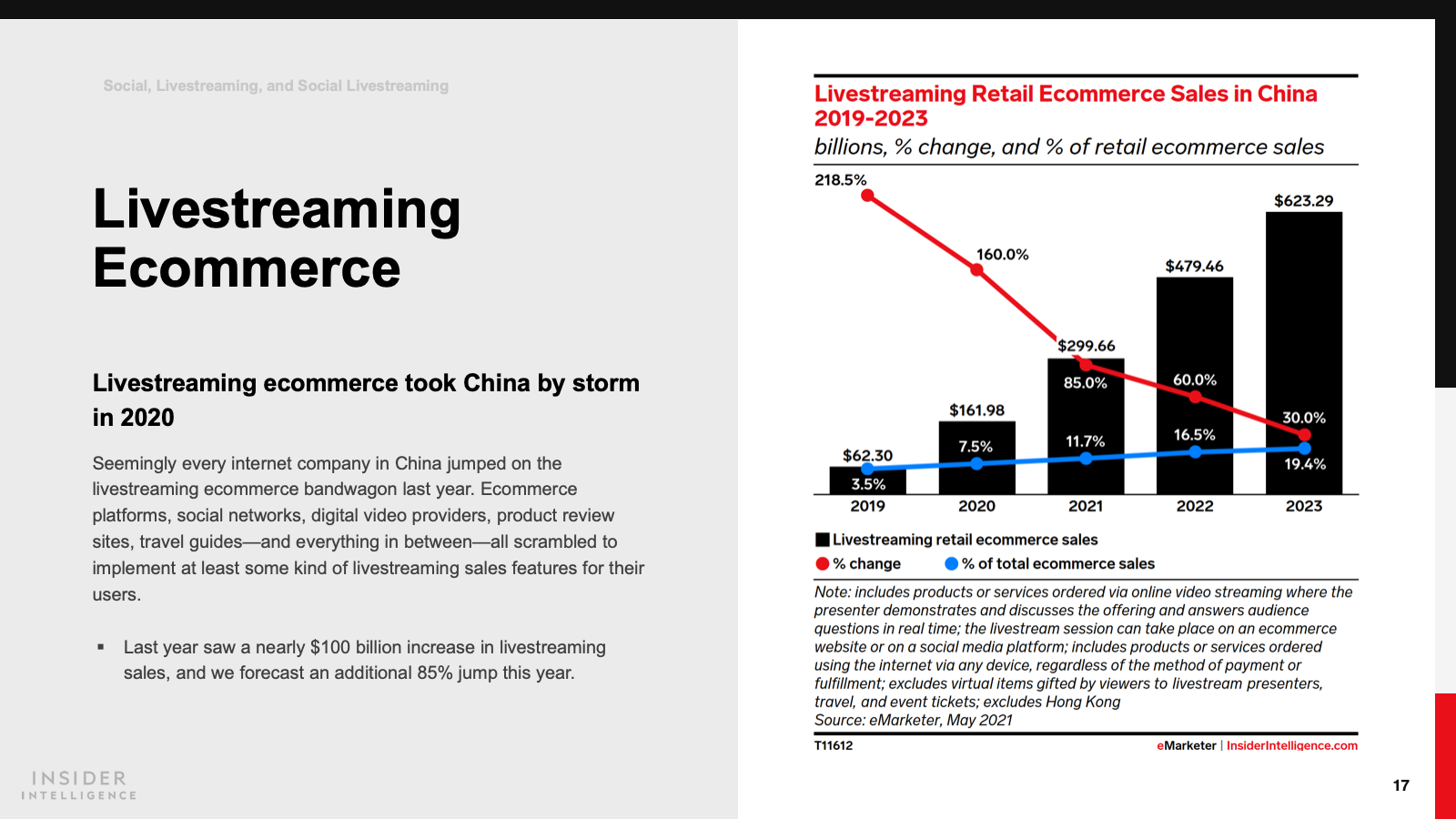 If China’s ecommerce livestreamers were their own country, they would be the third largest retail ecommerce market in the world this year ($299.66 billion in sales). Livestreaming ecommerce grew by 160.0% last year and will grow by another 85.0% this year.