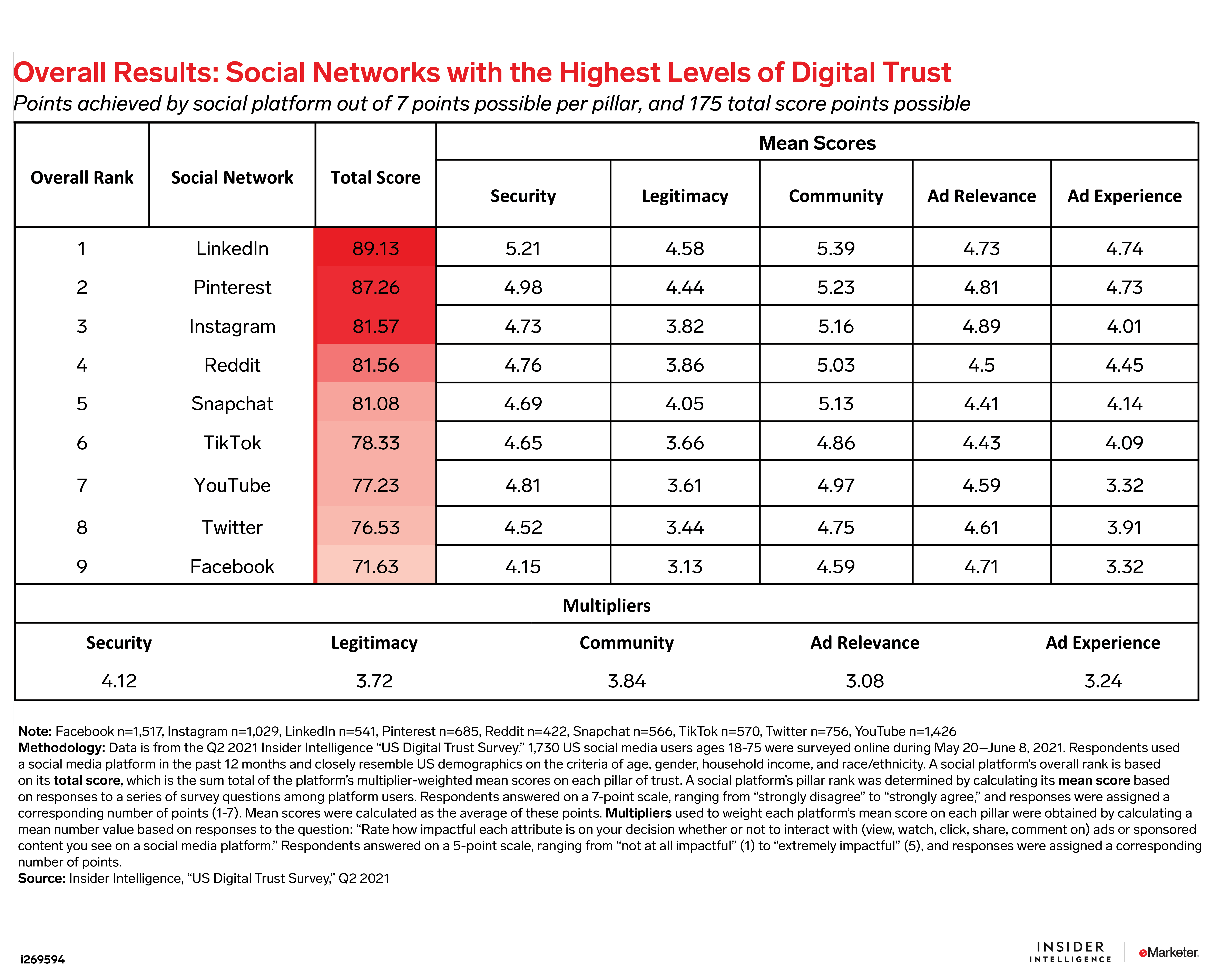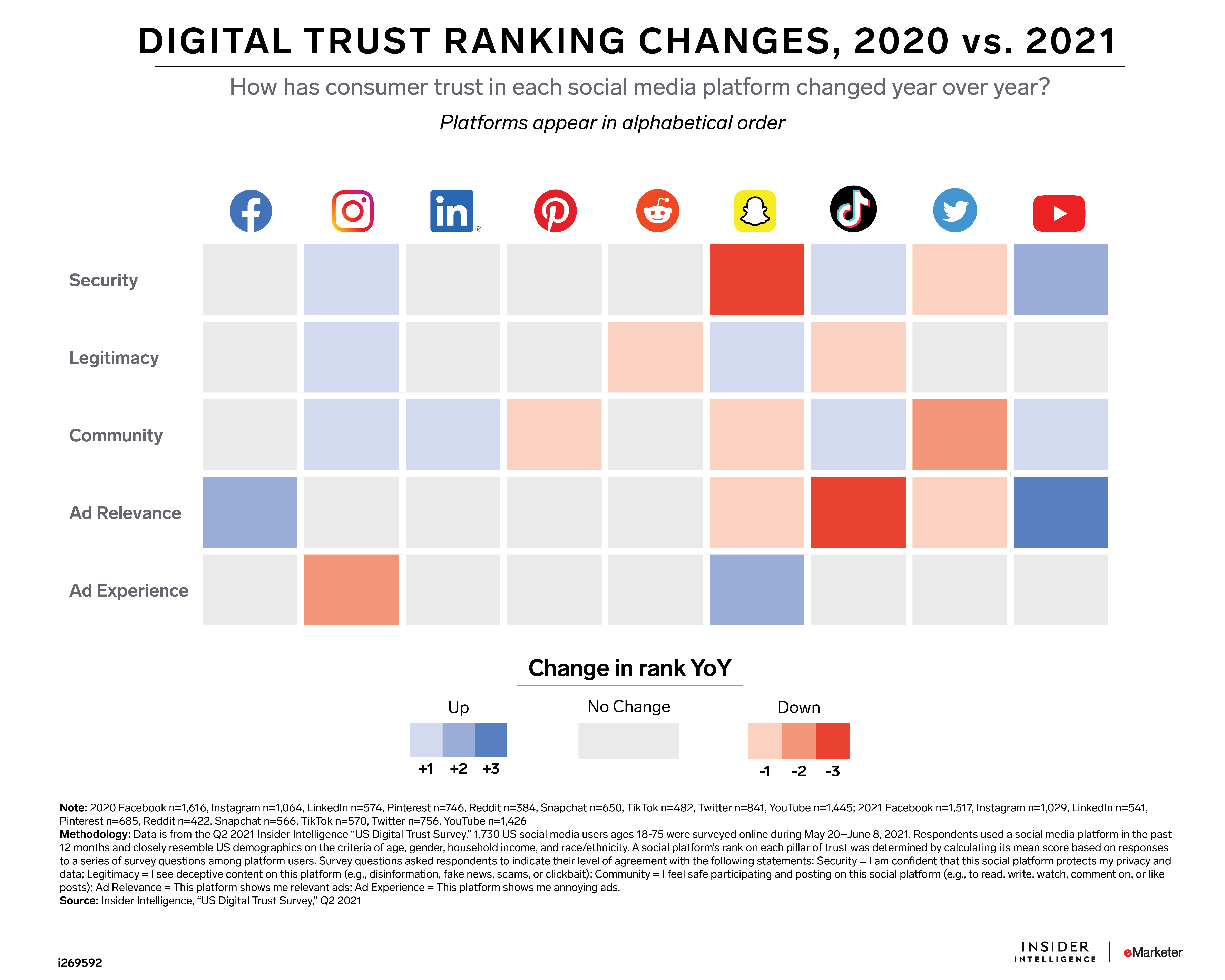 2. Which social platforms rank highest in our five pillars of digital trust—Security, Legitimacy, Community, Ad Relevance, and Ad Experience—and which ones are losing trust among social media users?