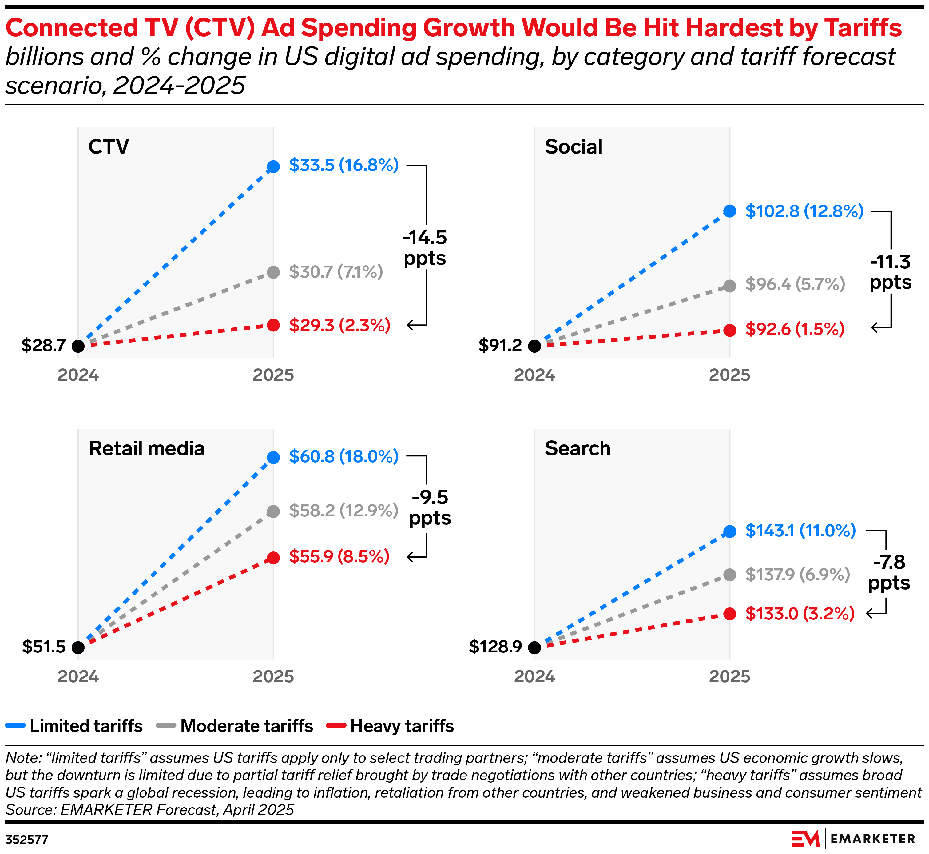 Though details change almost daily, the Trump administration’s continued focus on tariffs will bring higher costs and more uncertainty to the economic landscape. To help advertisers and media companies plan their responses, we have modeled how three tariff scenarios could affect US digital ad spending this year. In this report series, we explain how these scenarios will affect ad spending in four major channels—search, social, connected TV (CTV), and retail media—and who the winners and losers will be.