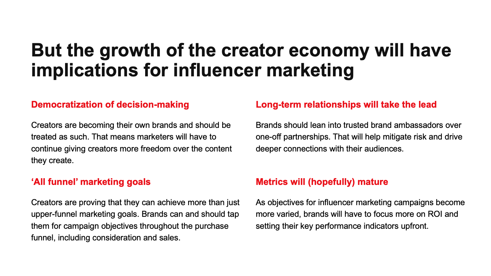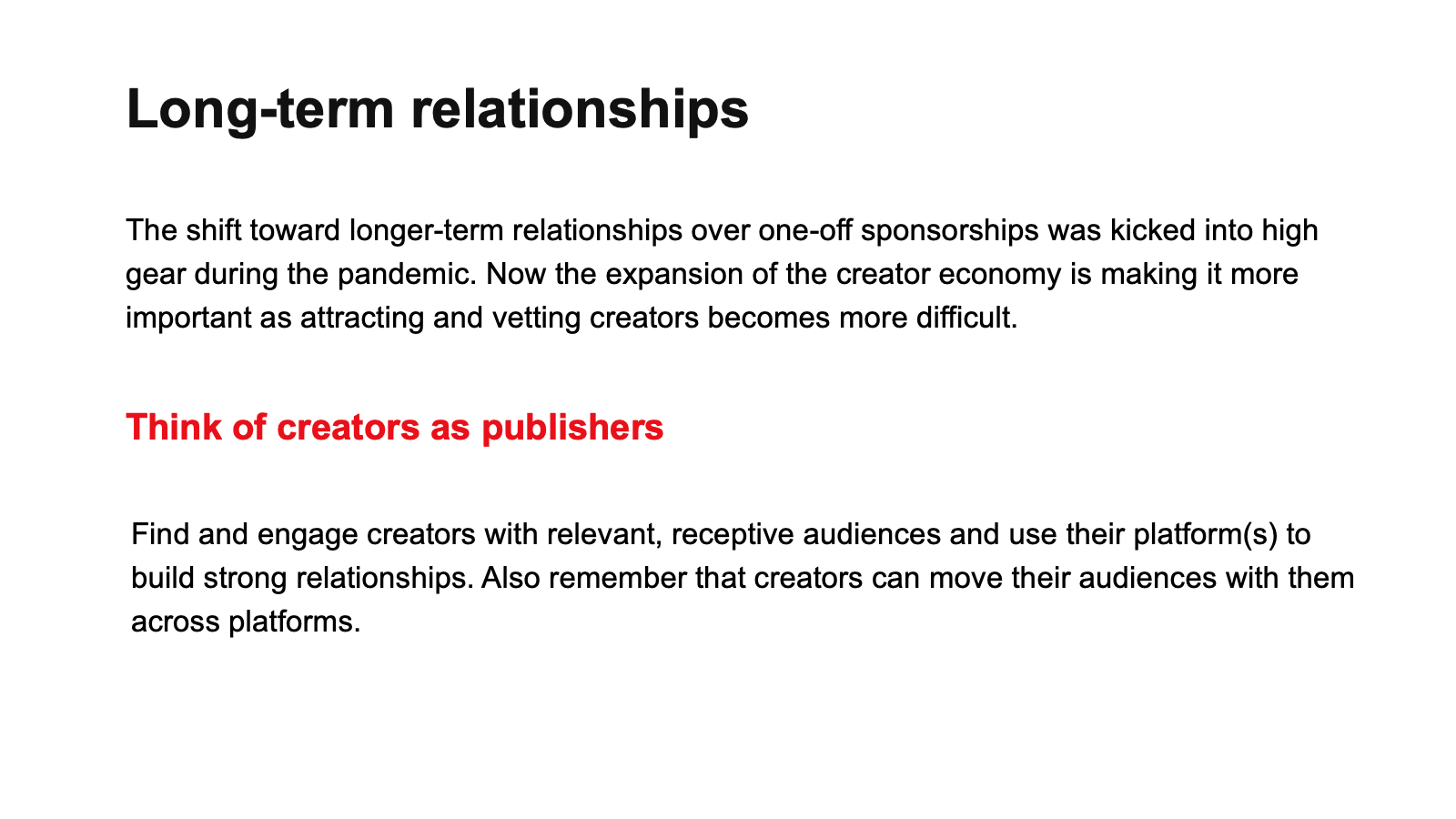Creators are becoming brands in their own right, and marketers should treat them as such. Think of creators as publishers: Focus on finding relevant audiences and building relationships.