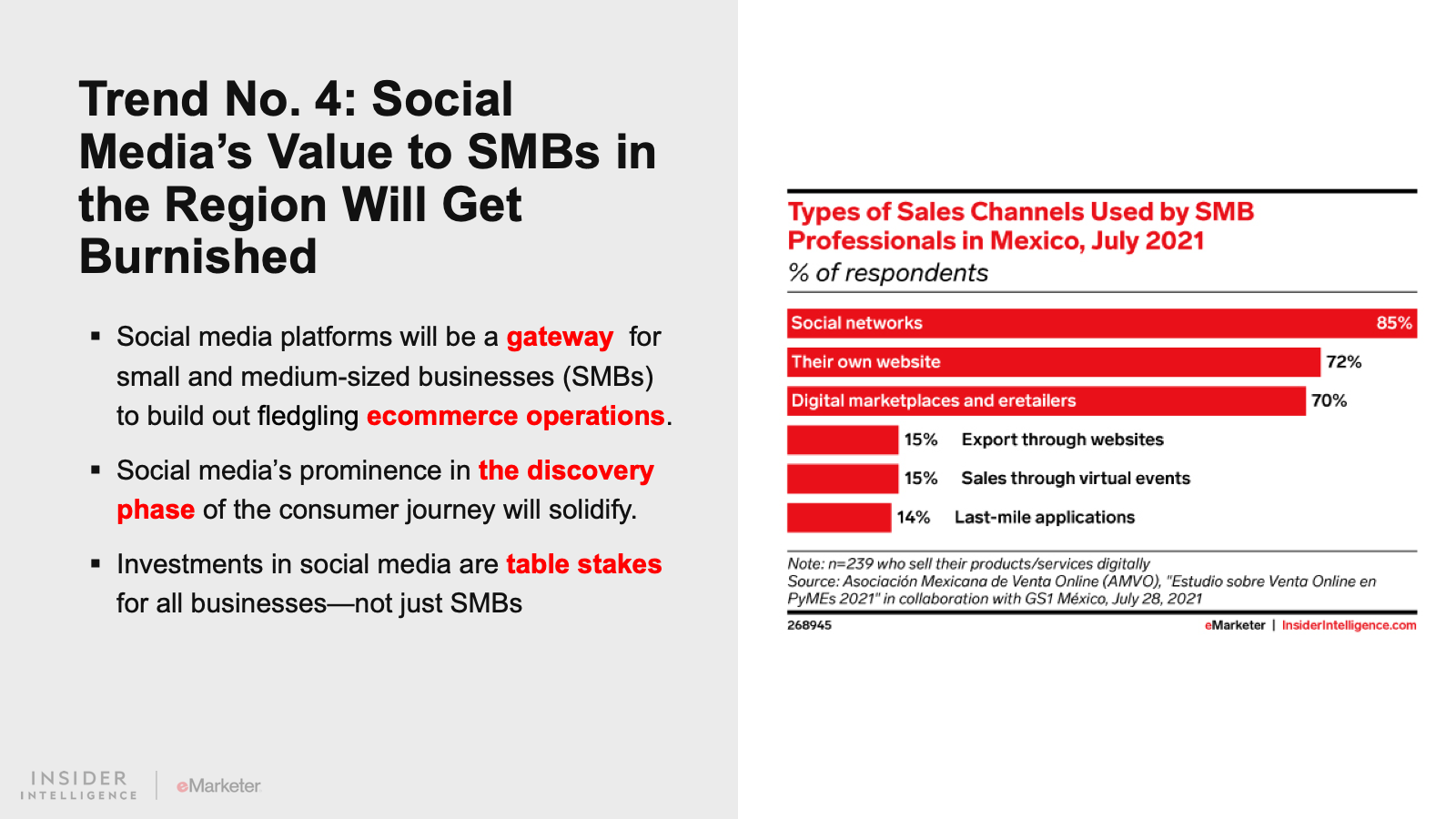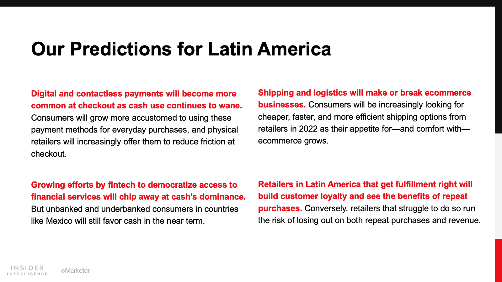 Latin America is no stranger to change, but consumers’ quick embrace of new digital habits grew at an unprecedented rate and scale like never before during the pandemic. In 2022, expect a surge in digital payment adoption, a change in consumer expectations around ecommerce, a struggle with sustainability issues, an embrace of social media by small businesses, and the rise of retail media networks in Latin America.