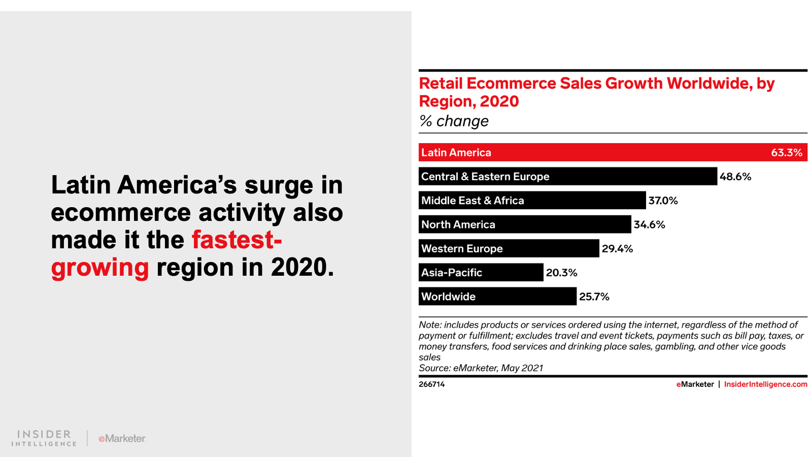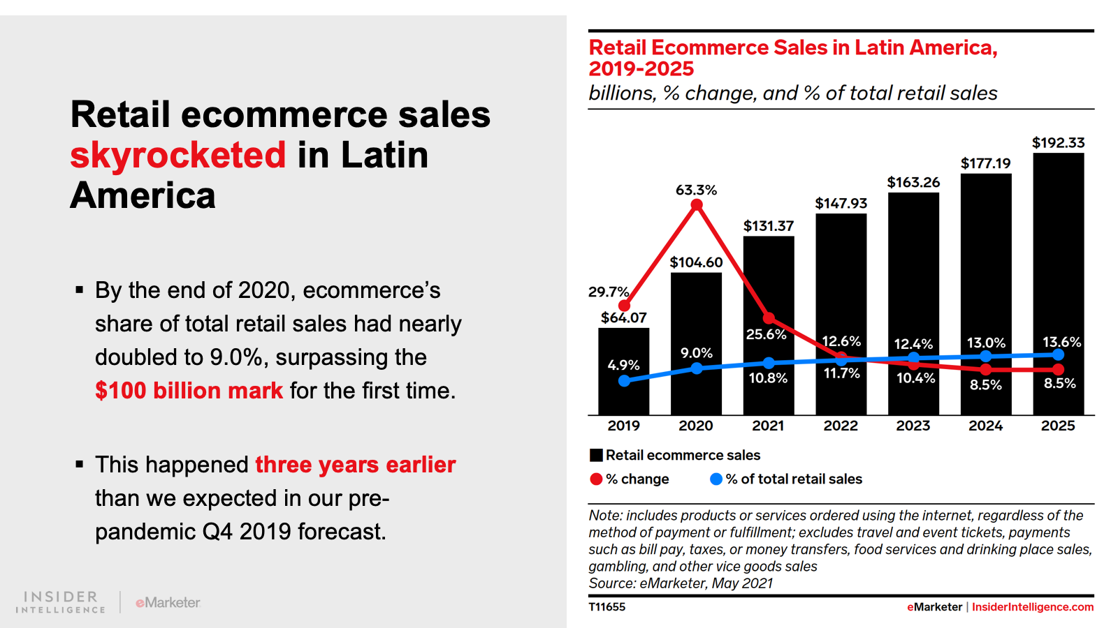 KEY STAT: Retail ecommerce sales in Latin America grew 63.3% in 2020 to $104.60 billion. This was five times greater than the 12.5% growth we estimated in our pre-pandemic November 2019 forecast and more than triple the 19.4% estimated growth in our May 2020 forecast.