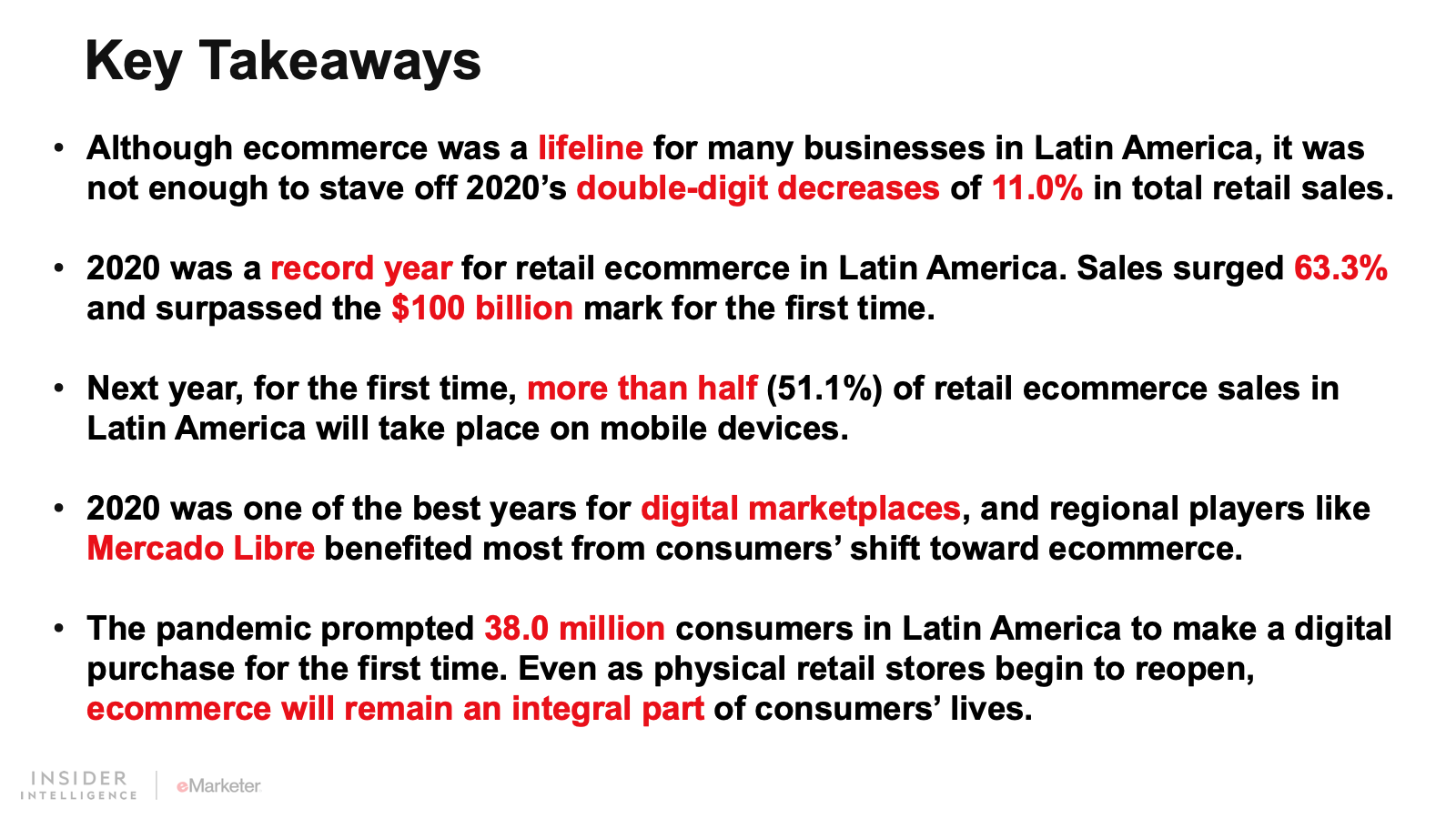 This report explores the pandemic’s impact on total retail, ecommerce, and mcommerce sales in Latin America, with breakouts for Argentina, Brazil, and Mexico. It also examines key drivers fueling regional market movements in 2021 and beyond.