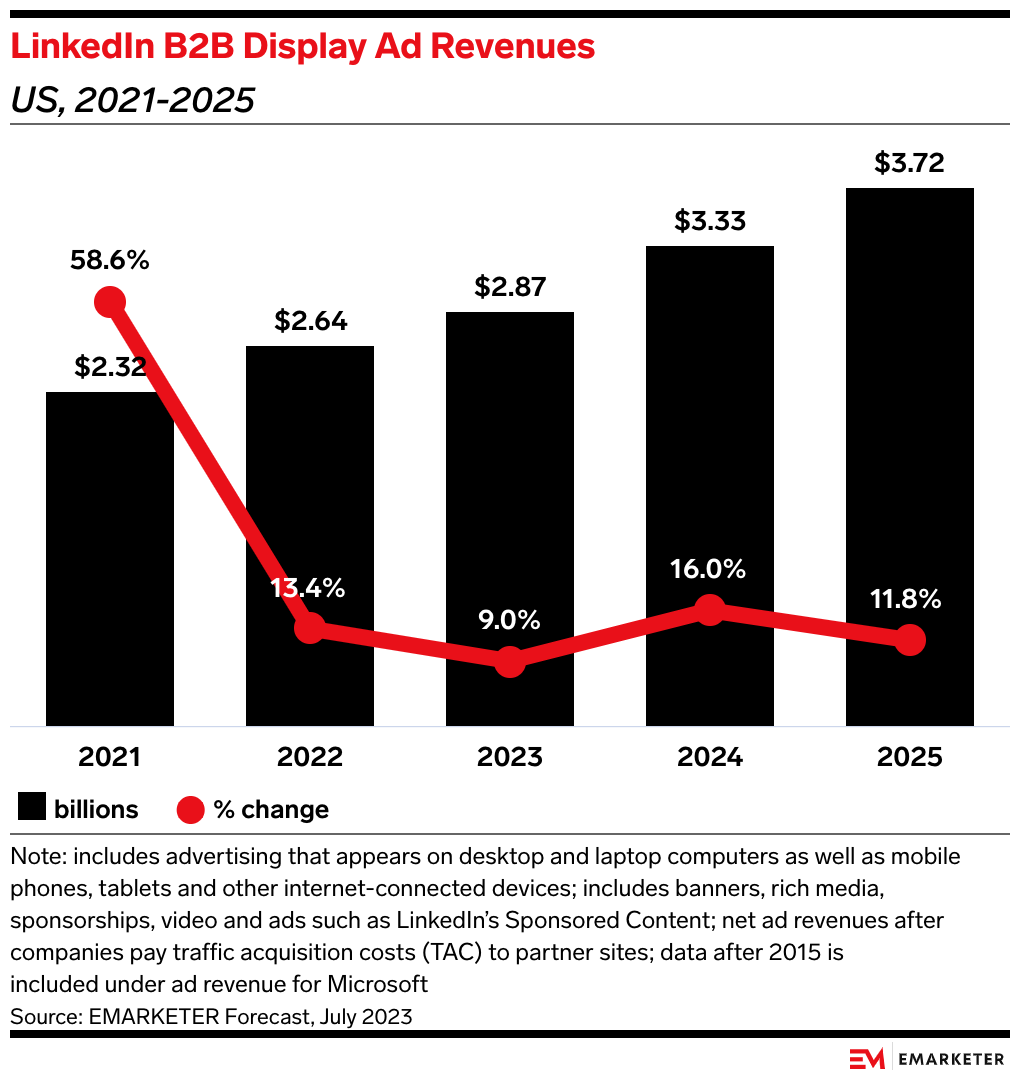 - Display revenues, which include video, are projected to outpace overall growth at 16%. However, there could be additional upside if LinkedIn continues to embrace video in a brand-safe way.
