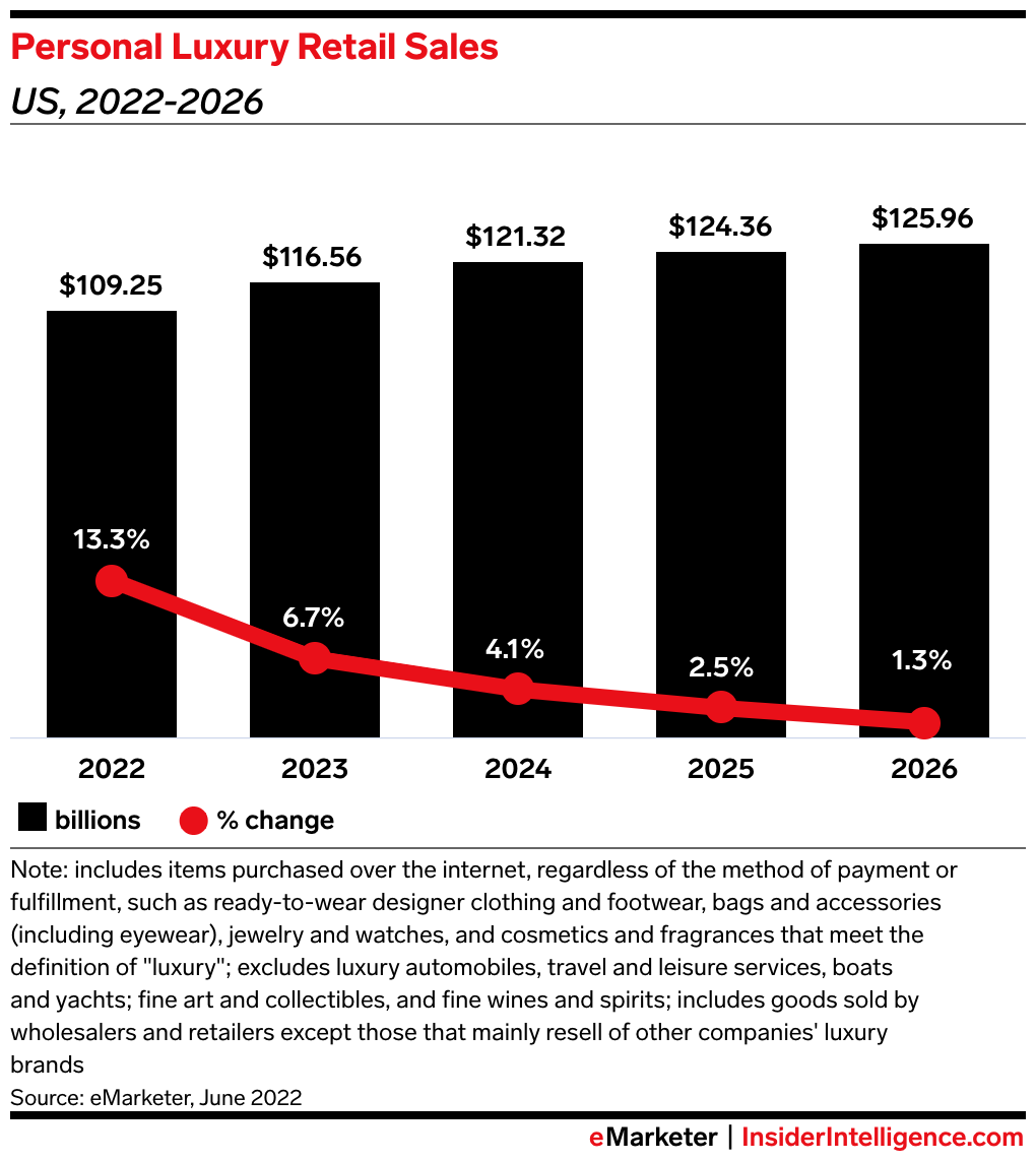 The big takeaway: Luxury shoppers aren’t entirely immune to economic headwinds. The macroeconomic environment is pushing the US luxury goods market back to its historical growth patterns after multiple atypical years stemming from the pandemic.