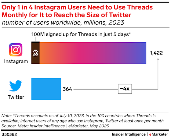 Key stat: In just five days, 100 million users signed up for Threads, compared with Twitter’s 364 million, according to our forecast.