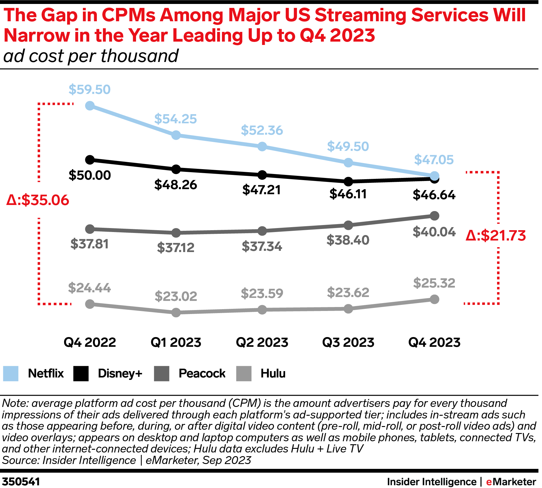 The range of costs per thousand (CPMs) on major US streaming services is narrowing as new entrants Netflix and Disney+ settle in the upper $40s with the former dropping from its near-$60 peak in late 2022.