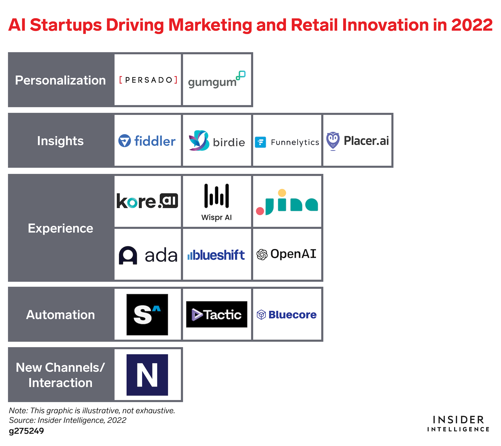 KEY STAT: Global investment in AI startups has slowed in H1 2022, after reaching a record-setting $51.29 billion last year in the US alone. But startups driving marketing and retail innovation are still poised for success.