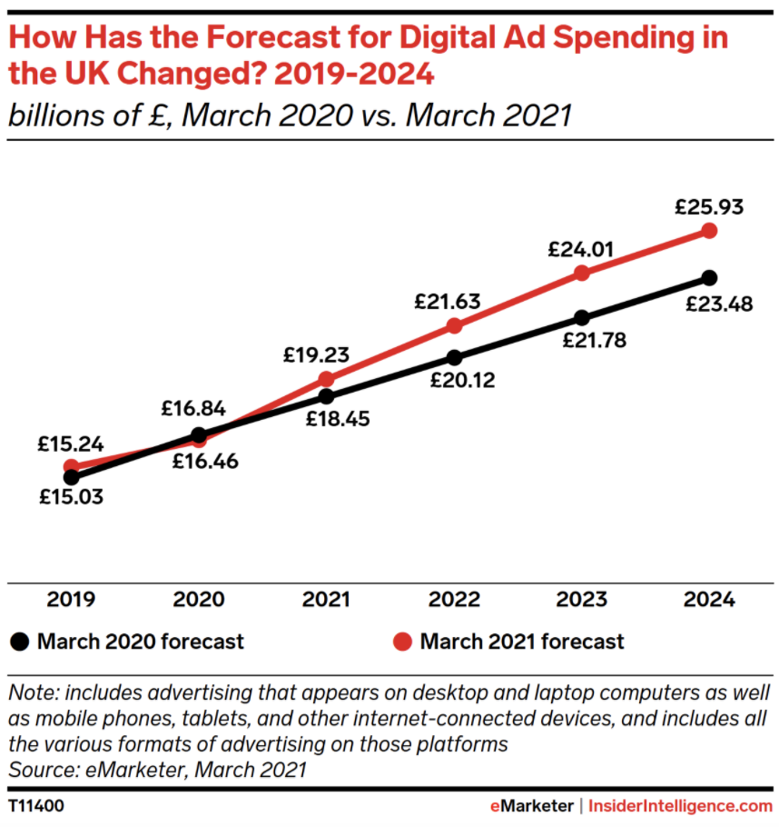 Meanwhile, Facebook benefited greatly from the clamor for display (and video) inventory. Its digital ad revenues were £4.55 billion ($5.83 billion) in 2020, up 19.6% YoY, which was faster than our pre-pandemic estimate (19.2%).