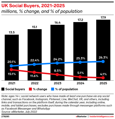 KEY STAT: There will be 15.1 million social buyers in the UK in 2022. That’s 5.5 million more than in 2019, before the pandemic. But social commerce is still in its infancy: Less than a quarter of the UK population will make purchases via social media this year, despite more than 80% now shopping online.