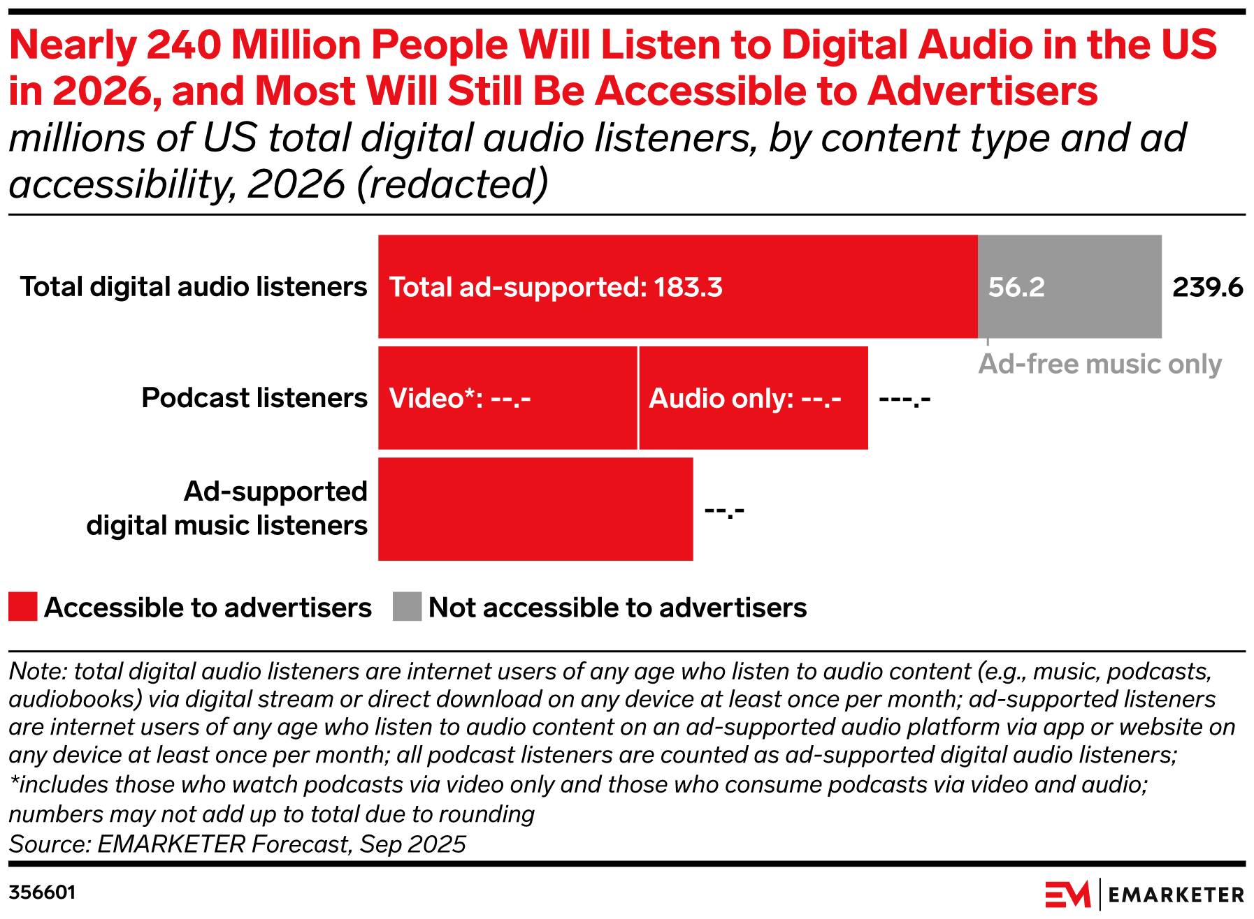 Key Stat: In 2026, 183.3 million of the total 239.6 million digital audio listeners will be accessible to advertisers. Much of that access will come via podcasts, which can always carry ads, even on ad-free subscription tiers.