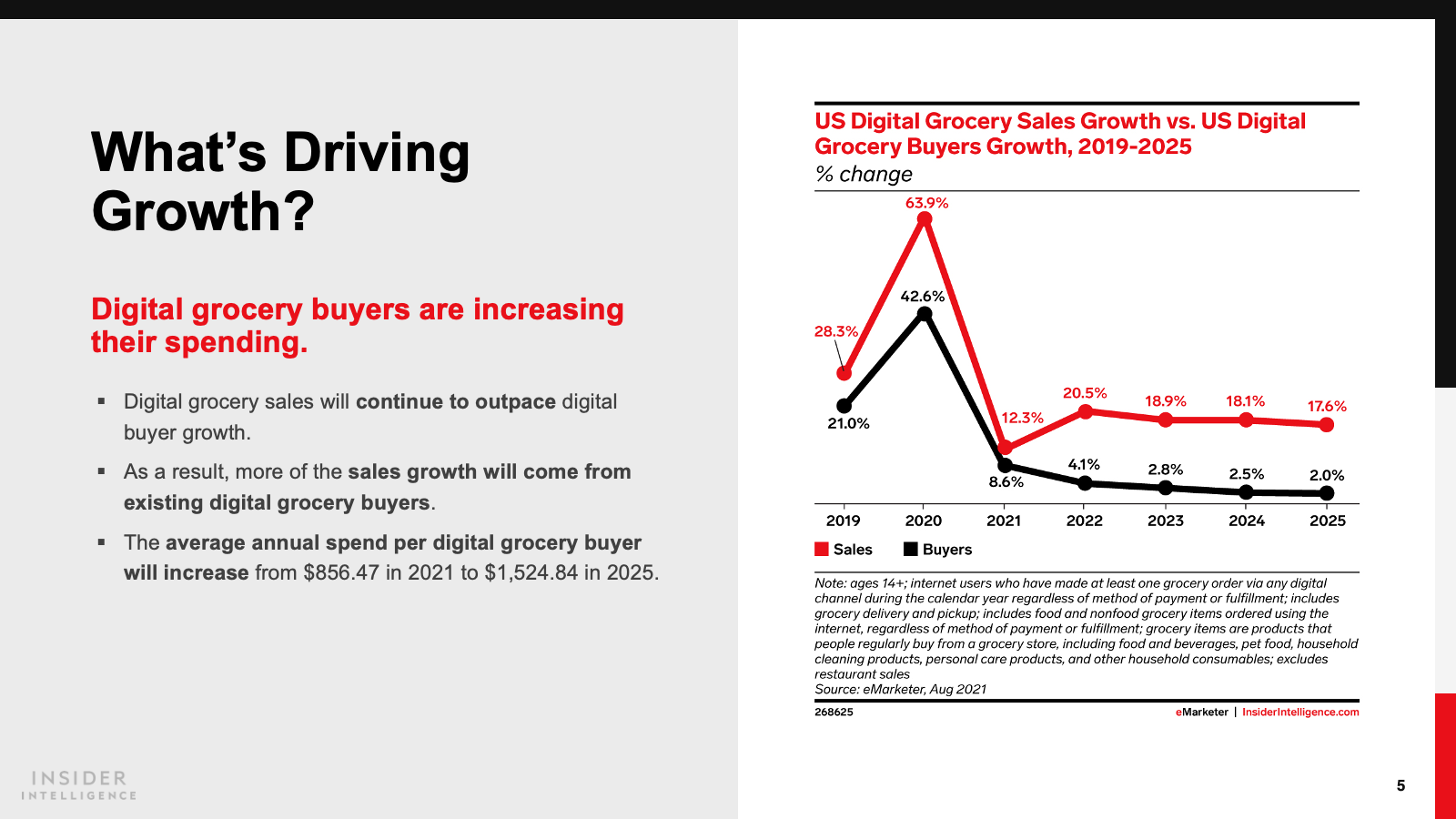 KEY STAT: US digital grocery sales grew 63.9% in 2020 and will grow another 12.3% this year, reaching $122.39 billion. Sales will nearly double by 2025, reaching $243.67 billion.