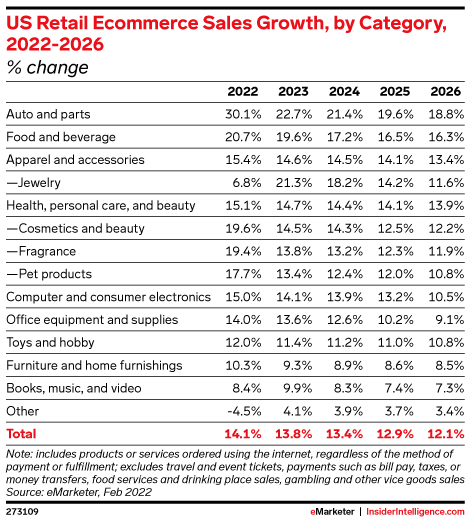 KEY STAT: Auto and parts, and food and beverage—two categories with historically low levels of online purchases—will be the fastest-growing product categories in ecommerce this year.