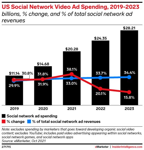 KEY STAT: In 2022, advertisers will spend $24.35 billion on video advertising that appears on social networks, up 20.1% YoY.