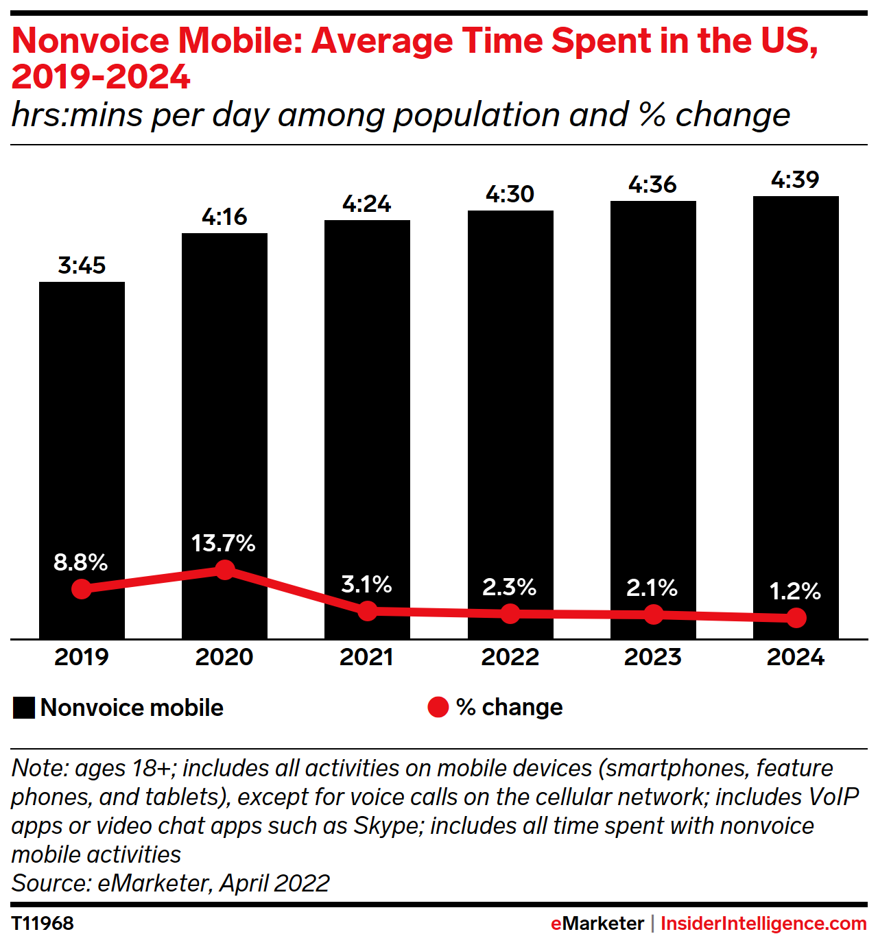 KEY STAT: On average, US adults will spend 4 hours, 30 minutes (4:30) daily using mobile devices for nonvoice activities in 2022, compared with 3:07 per day watching traditional TV.