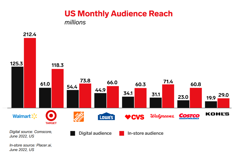 The top three retailers by US monthly audience reach (both in-store and digital) are Walmart, Target, and The Home Depot. The number of in-store shoppers exceeds digital shoppers at each retailer, indicating that in-store media has a bigger reach. But it also means digital has more room for growth.