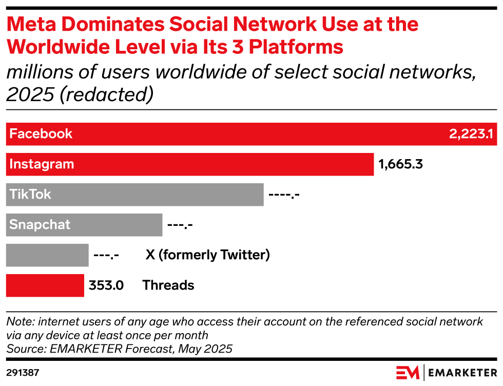Social network user growth will be slow on a worldwide level, but 2025’s meager 2.9% increase will still equate to more than 115 million new users. Facebook remains in the lead in most countries and regions, even though its share of internet users is declining.