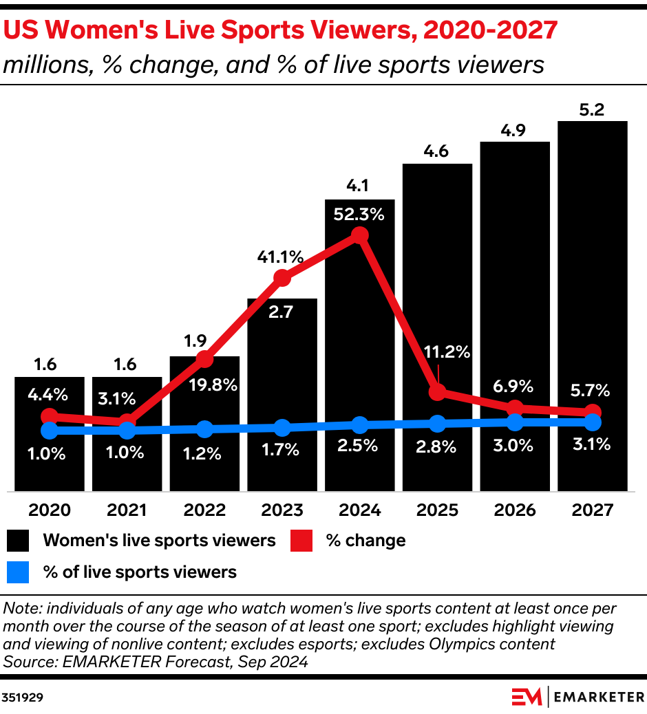 The news: Women’s sports is continuing to grow in relevance, reaching new milestones in 2024, per research from the charity Women’s Sport Trust. Leagues like the Women’s National Basketball Association (WNBA) grew significantly across social media in the 2024 season, reaching a single-season record of nearly 2 billion video views across WNBA social media platforms—more than quadruple the previous season. Our take: As more brands invest in women’s sports and viewership spikes, advertisers must recognize women’s sports not as a niche category only relevant for select moments, but as a critical part of a comprehensive sports marketing campaign.