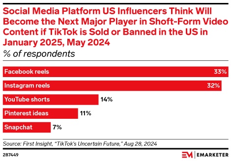 A third (33%) of US influencers believe that if TikTok is sold or banned in the US next year, Facebook Reels will become the next major player in short-form video, per August 2024 data by First Insight. Instagram Reels is close, at 32%.